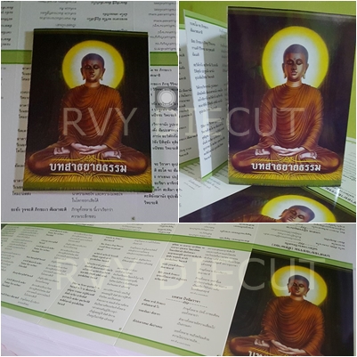 งานแผ่นพับบทสวดมนต์ อาบยูวีให้สวยงาม และมาปั๊มเส้นพับเพื่อพับเป็นรูปเล่ม