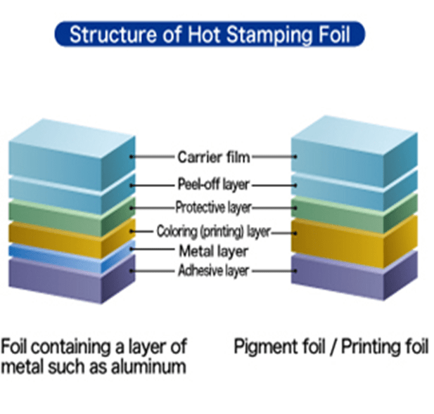 Hot stamping foil ประกอบด้วยฟิลม์โพลีเอสเตอร์ (PET Film) มีความหนาราว 12-16 ไมครอน และสารเคมีหลายชั้นที่เคลือบบนพื้นผิว เช่น สี อลูมิเนียม กาวเป็นต้น ซึ่งมีความหนาราว 0.02ไมครอนเท่านั้น
